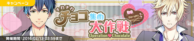 2017年2月1日~2月28日に実施されるログインボーナスやデイリーミッションをクリアして「チョコ」をもらい、集めたチョコを気になるカレにプレゼントすることができます。集めたチョコは、2月14日4:00以降、キャンペーンページより任意のカレひとりにつき、ひとつずつ渡すことができます。チョコは集めた分、様々なカレに渡すことができます。