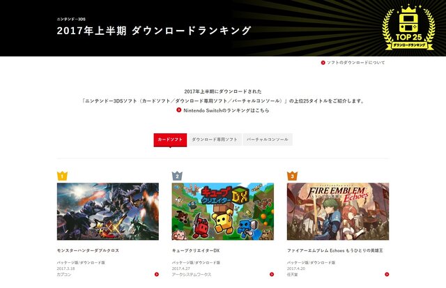 任天堂は、Nintendo Switchおよびニンテンドー3DSにおける2017年上半期のDLタイトルランキングを発表しています。
