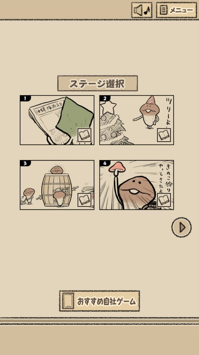 完全無料で全 28 ステージの謎解きに挑戦できます。各ステージはなめこの公式サイト 「なめこぱらだいす」で連載中の4 コマ漫画をベースとしており、各ステージをクリアするとその4コマもアプリ内でお楽しみいただけます(一部 4 コマがないステージがあります)。また本作のために用意した未公開の書き下ろし4コマも7本収録しています。なめこ4コマ「なめこタイムDX」は毎週水曜更新で連載中!