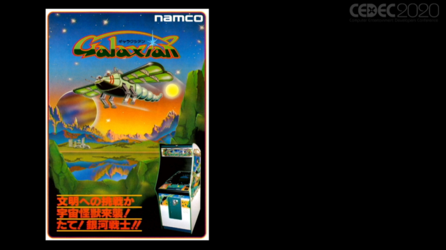 そこで例に挙げられたのは『ギャラクシアン』のキービジュアル。これはナムコのタイトルとして大ヒットを記録し、キービジュアルが一枚の絵で描かれた初めてのタイトルでもあったそうです。グラフィックデザインは社内で描かれたものだと伝えられています。