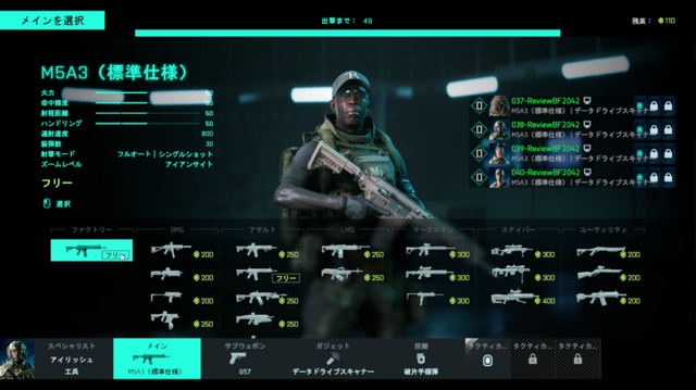 出撃準備画面では銃やガジェットをポイントを使用して購入していきます。メインウェポンにはあらかじめアタッチメントが付いており、カスタマイズはできませんでした。