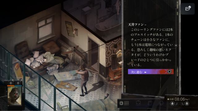 自分好みに作ったわりにいまいち感情移入できない主人公の目に入ったのは、天井にあるシーリングファンに絡まったネクタイ。刑事はパンイチなので、まずは服を集めねばなりません。刑事が持つスキルでありながら人格のひとつである“内陸帝国”も、脳内から「あなたさまはふたたび首に巻き付けたいと思っておいでです」と語りかけてきました。