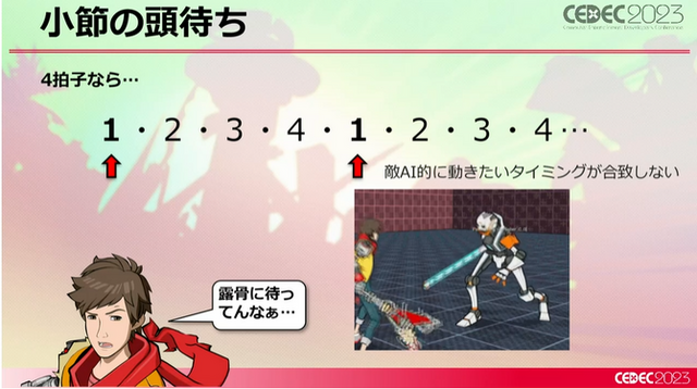 そもそも山田氏がなぜ大変そうと感じたかというと、やはり「アクションゲームは好きなタイミングで動きたい」もので、リズムゲームの音に決められた動きとは相性が悪いことを指摘。これは先述のジョハナス氏が語った問題そのままであり、山田氏はこの問題を具体的にクリアしていく必要がありました。