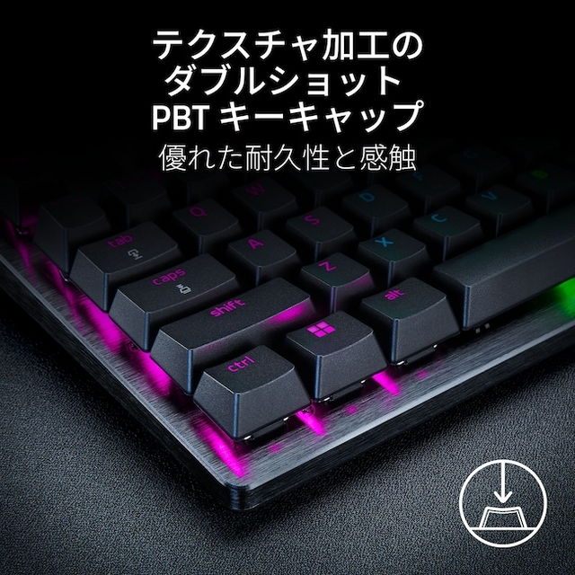 フルサイズ、テンキーレス、Mini (60%) の3種類のサイズを展開。用途に合わせて、好みのサイズを選択可能。Razer Huntsman V3 Pro Mini は、デュアルパーパス修飾キーを搭載し、右Shiftキーや右Altキーなどをカーソルキーとして使用可能。コンパクトなデザインを維持しつつ、利便性も実現しています。