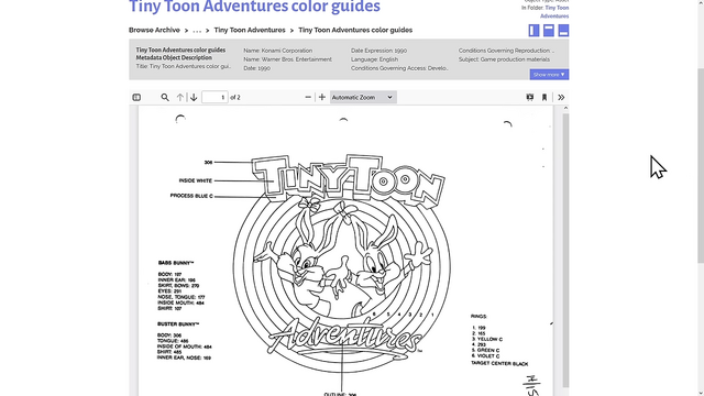 また、ゲーム開発者やパブリッシャーから入手した開発資料も掲載。例としてコナミのゲーム『タイニートゥーンアドベンチャーズ』ロゴの公式仕様が公開されています。