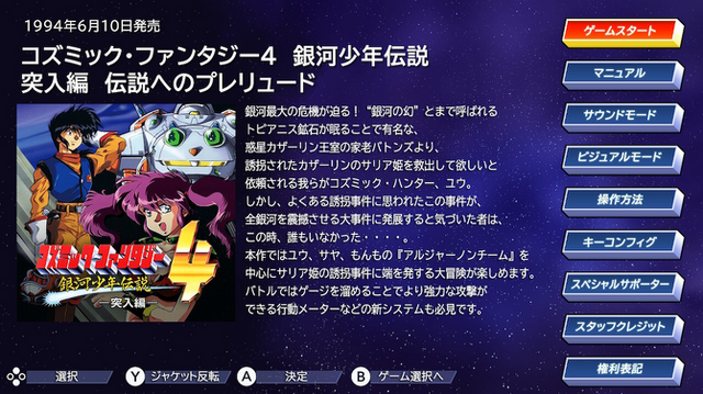 各タイトルごとにゲーム本編や当時のマニュアルのほか、ゲーム内のBGMやビジュアルシーンなども収録されています。また、メニュー画面では3と4の主題歌「コズミック・ファンタジー」のボーカル版が流れるなど、シリーズファン向けの要素が満載です。