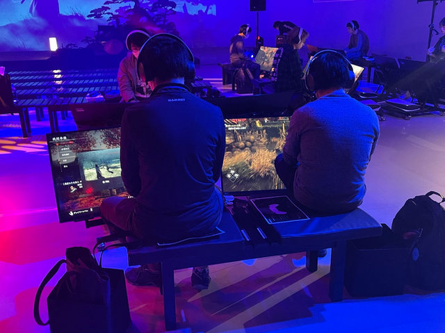 会場内はライトアップされており、本作の雰囲気につつまれながらユーザーがゲームを先行プレイしていました。会場内の椅子は縁台になっており、細かなところまで彩られています。
