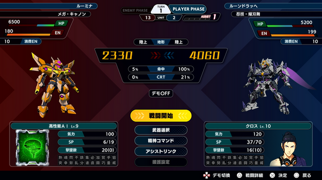 さらに、スパロボの本質は残しつつも各種UIについてはデザインを一新。戦闘時のコマンド選択はリスト式に回帰し、戦闘前画面では細かいダメージ予測値が表示されるようになりました。