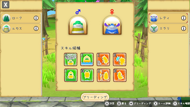 探索で得た経験、たとえば「木を揺らす」「小さな崖をジャンプする」などでミームたちは経験を通じて、スキルを獲得します。スキルは2種類あって「基本スキル」「進化スキル」が存在しています。ふたつずつ、計4個のスキルがひとりのミームが持てる最大数。4個といわず推しのミームにたくさん持たせたいところですが、えこひいきは出来ません。