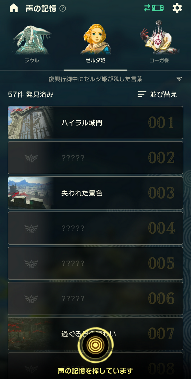 これを利用するには、「ZELDA NOTES」内の「声の記憶」(もしくは後述する「おしえてナビ」)を起動しておく必要があります。どちらかの『ゼルダ』を起動した状態で「声の記憶」を起動すると、ゲームと連動され、「声の記憶を探しています」と表示されます。その状態で、声の記憶がある付近にゲーム内で近づくと、スマートフォン上の「声の記憶」のセンサーが反応します。「ほこらセンサー」のような感じで声の記憶の位置を探り当てるイメージで特定の場所にたどり着くと、スマートフォン上で「声の記憶」が再生されます。