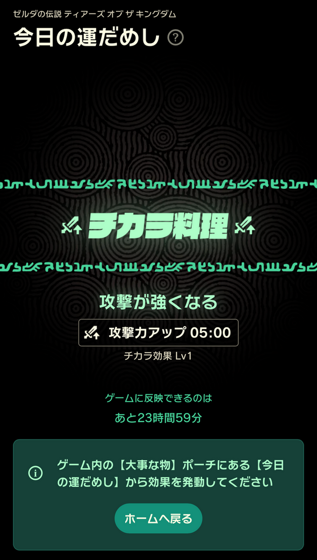 そのほかにも、「ZELDA NOTES」にはいろいろな機能があります。「今日の運試し」は、1日1回、ゲーム内で様々な効果(武器の耐久度回復や、料理の効果、バッテリーの上限上昇など)を発動できるおみくじのような機能。「マイプロフィール」では、さまざまな達成項目が用意されたいわゆる実績機能のようなものが見れます。「みんなのプレイデータ」では自分のプレイ記録と世界のプレイ状況を比較するなんてことも。