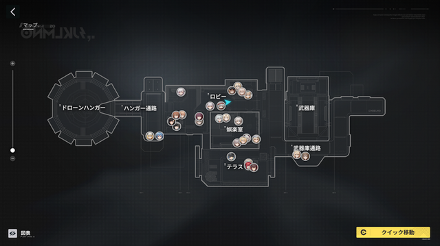 部屋は今のところ「ロビー」「娯楽室」「テラス」「通路(2種)」「武器庫」「ドローンデッキ」が存在しています。驚くべきは、現在で最大28キャラも配置できるということ。『ドルフロ2』の3Dキャラは完成度が高いですが、処理落ちとかは筆者のスマホ、PCでは現状発生していません。