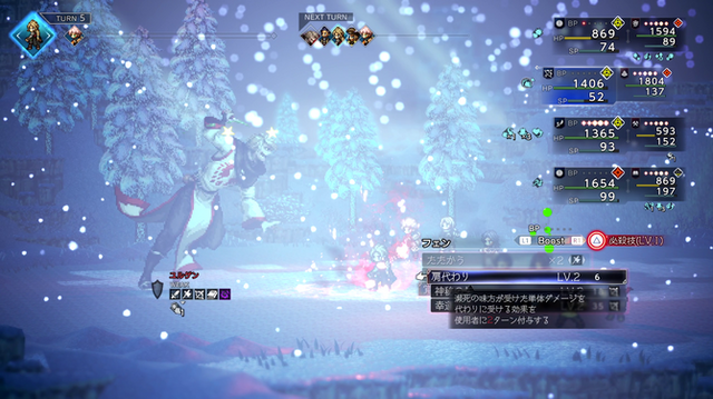 プレイヤーは毎ターン補充されるBPを消費して、強化された攻撃や、攻撃回数を増やす「ブースト」ができます。サポート役がブーストで攻撃回数を増やし、DPS役がブーストした強力な攻撃を叩き込むのが定番の戦い方です。過去作ではブレイク直後のラッシュでBPが空になり、数ターン我慢の時間がありましたが、今作は8人もいるのでラッシュ後のガス欠がありません。