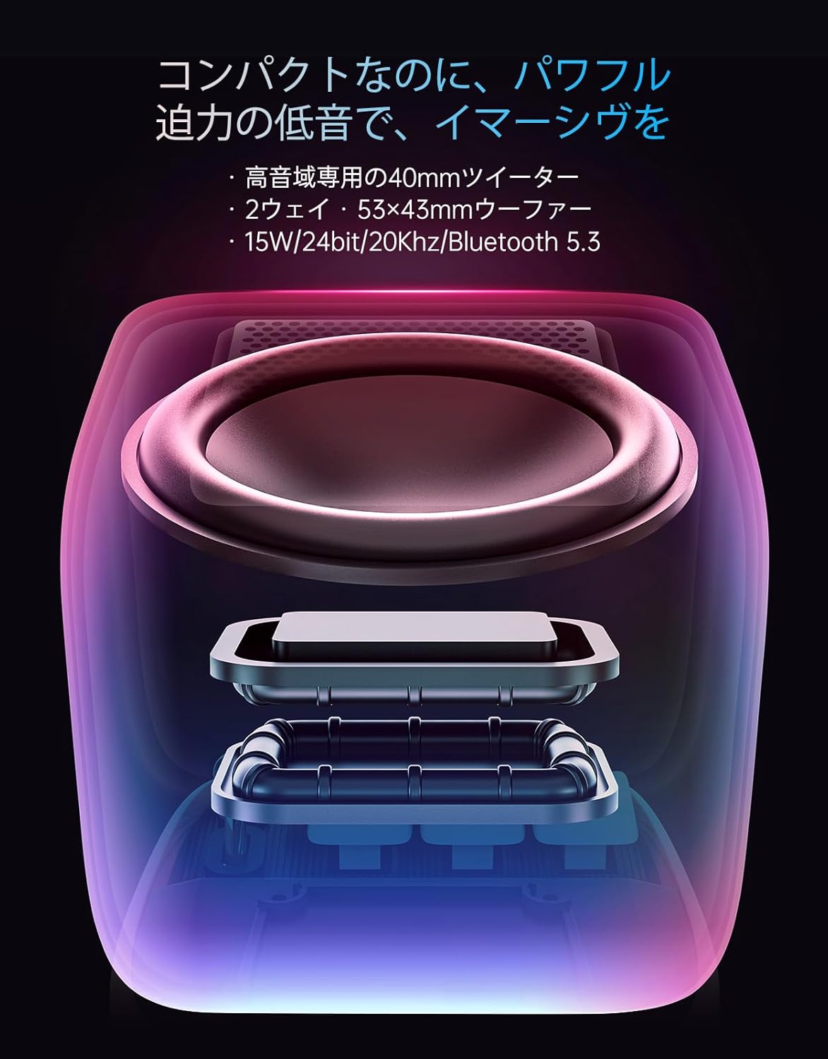 このモデルのポイントは、小さいのに15W出力と58mmドライバーを搭載している点です。サイズ以上の重低音と広がりを意識した設計で、動画視聴やゲームのBGMがぐっと厚く感じられるようになります。Bluetooth 5.3接続だけでなく、TFカード再生やPCとのUSB接続にも対応しているため、日常の使い方に合わせて入力方法を選べます。