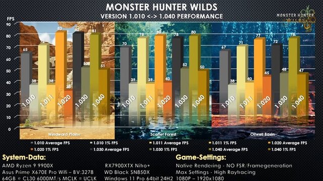 パフォーマンスの検証は各タイトルアップデート配信後の1.020(第2弾)、1.030(第3弾)、1.040(第4弾)のバージョンにて、「隔ての砂原」、「緋の森」、「油涌き谷」をそれぞれセクレトに乗りながら駆け回る形で計測。グラフでは第1弾である1.010と、『ストリートファイター6』コラボが配信された1.011の2バージョンも交えて比較されました。