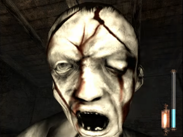 2つ目は、「生々しい“異形”へと変貌した敵」です。オリジナル版の怨霊は、ポリゴンの制約もあり、ある種「記号的な存在」でした。しかしリメイク版では、怨霊の皮膚の質感、死に際の水ぶくれ、衣服の汚れ、そして瞳の濁りまでが精緻に描写されています。