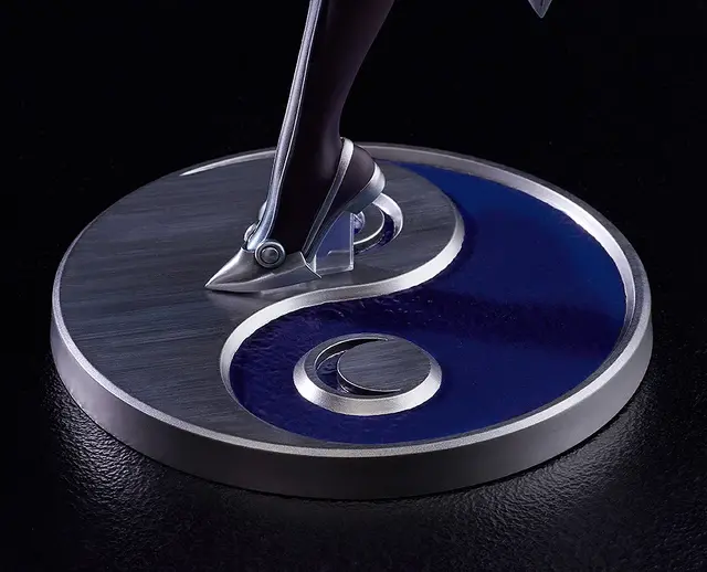 細部まで緻密に造形された衣装は布、紐、革、甲冑それぞれの素材感を再現。台座はリーシャのもつ、光<月の舞姫>と影<伝説の凶手> 両側面を表した銀の対極盤になっています。